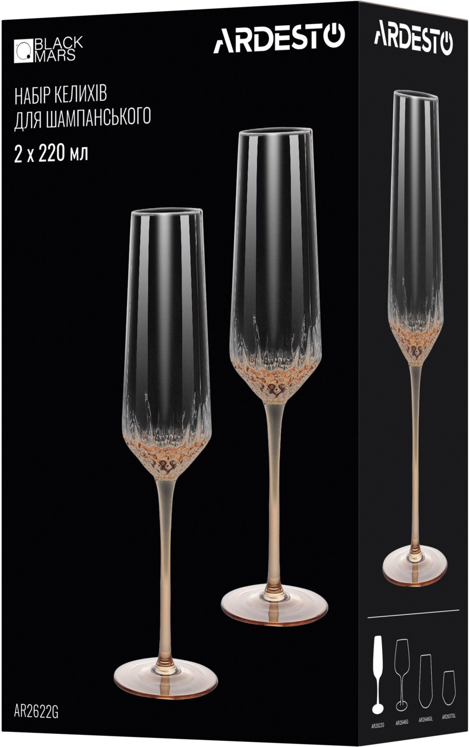 - Набір келихів для шампанського ARDESTO Black Mars Favola 220мл, 2шт, скло, прозоро-золотистий (AR2622G)