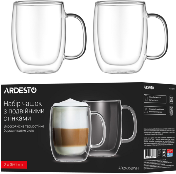 - Набір чашок з ручками і подвійними стінками ARDESTO, 350мл, 2шт (AR2635BWH)