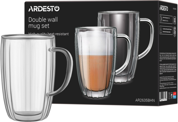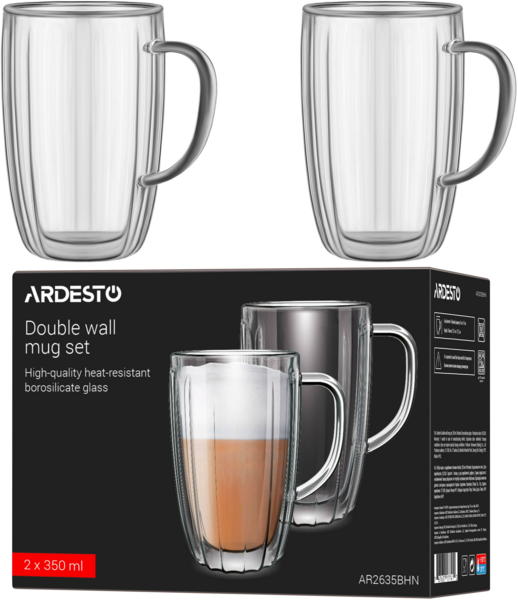 - Набір чашок з ручками і подвійними стінками ARDESTO 350мл, 2шт, боросилікатне скло, прозорий (AR2635BHN)