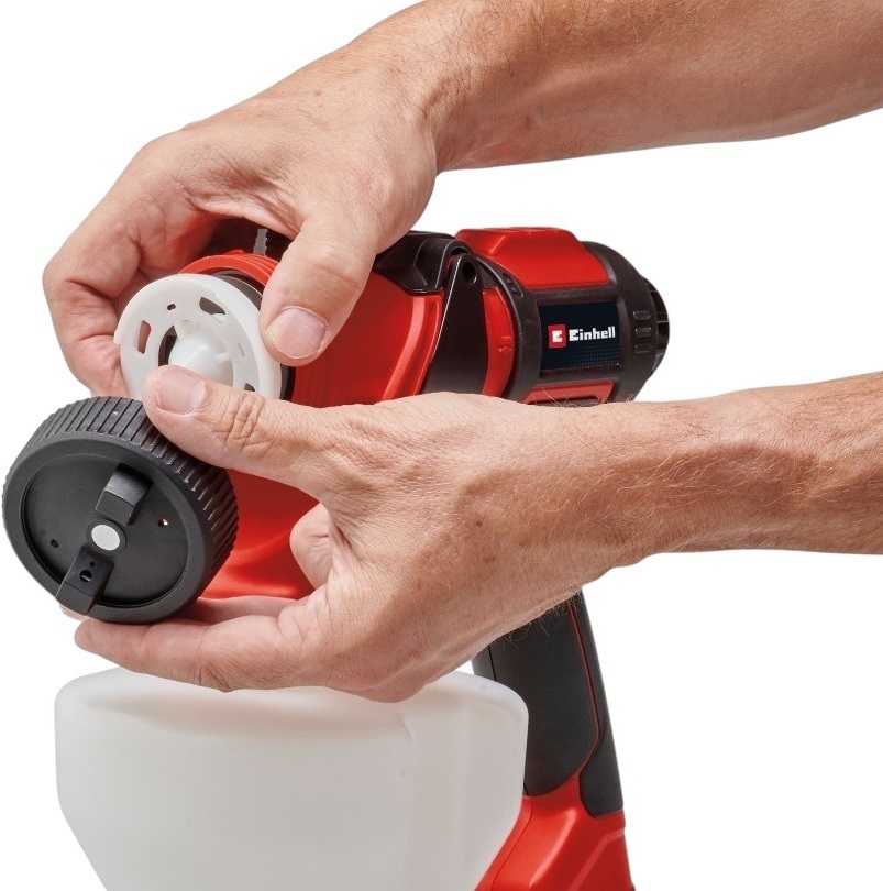 Однією з ключових переваг цієї насадки є її неймовірна легкість та швидкість встановлення. Голова пістолета-розпилювача, яка є частиною комплекту, інтегрується з системою розпилення фарби Einhell TE-SY 18/90 Li буквально за лічені секунди. Так само легко та швидко приєднується й сам бак для фарби ємністю 1200 мл. Це дозволяє вам мінімізувати час на підготовку до роботи та зосередитися безпосередньо на процесі фарбування.