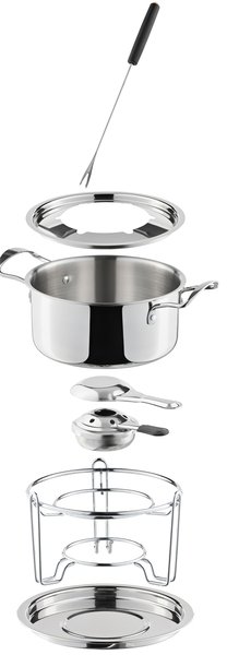 Набір для фондю розрахований на шість персон і включає в себе 10 предметів: каструлю для фондю, пальник, стійку, підставку і шість виделок. Каструля і всі комплектуючі виготовлені з високоякісної нержавіючої сталі, а ручки вилок з жароміцного пластика. Для очищення набору можна використовувати посудомийну машину.