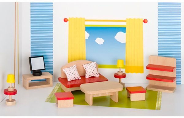Безліч дерев'яних меблів зібрано у німецького виробника Goki. Тут є і спальні і вітальні, і ванні кімнати, і кухні, ресепшн, садові меблі і меблі для кафе. Зроблені вони до найдрібніших деталей. Екологічні, надійні і безпечні для дітей. Саме такі меблі для вітальні кімнати в наборі, в якому йдуть в комплекті ще й світильники, телевізор і подушки. Рольові ігри корисні для дітей тому дуже добре забезпечити їх необхідними і безпечними речами для них. На їхньому прикладі добре вчити дітей правилам поведінки, соціальним навичкам, розвитку мовлення.