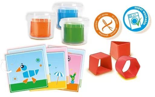 Що може бути веселіше за гру з масою для ліплення? Відкривайте фвідмінності між формами та кольорами! Уважно подивіться на картки та знайдіть відповідні форми та кольори маси для ліплення, щоб завершити свою фігуру на картці. Маса для ліплення особлива тим, що не засихає під час гри, довгий час залишається м'якою, її сліди на одязі та інших небажаних місцях легко відпираються. Важливою її властивістю є також солоний присмак, завдяки чому ви можете не боятися, що дитина захоче з'їсти масу. Після використання тримайте масу в закритих баночках.