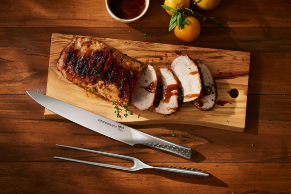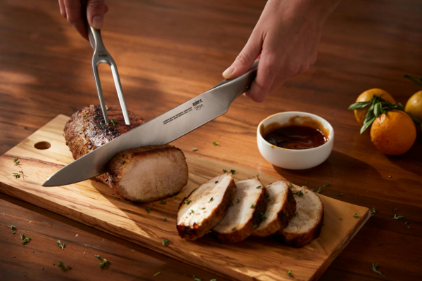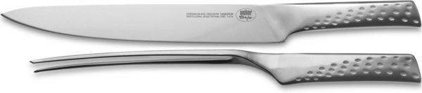 Фірмовий набір для нарізки від Weber стане хорошим помічником у підготовці страв до столу. До набору входить ексклюзивний ніж, який дасть змогу якісно порізати філе, а також виделка, яка допоможе підтримувати страву іншою рукою. Довгостроковість служби забезпечує високоякісна нержавіюча сталь. Завдяки елегантному дизайну фірмовий набір пасує до будь-якої кухні.