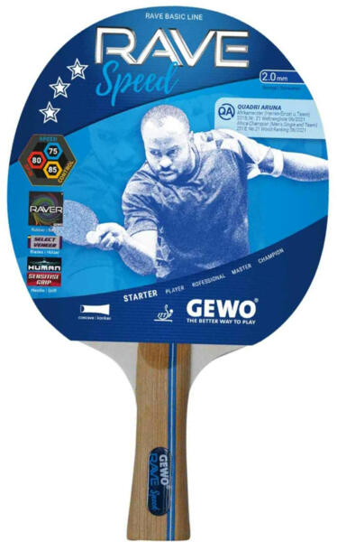 Ракетка для настільного тенісу Gewo Rave Speed — ідеальний вибір для амбітних любителів. Основа з п’яти шарів ретельно відібраного шпону в поєднанні з сертифікованою ITTF накладкою Gewo Raver із м’якою губкою забезпечує відмінні ігрові характеристики.