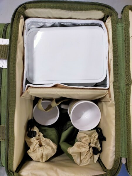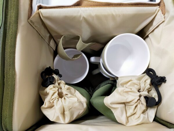 У наборі передбачено практично все для відчуття повного комфорту на природі. Придбавши такий набір, Ви будете забезпечені всім необхідним для приємного відпочинку. Термовідсік у сумці розділений на дві половини, за необхідності перегородку (на липучці) можна прибрати. Щоб чашки не займали багато місця, в середині термовідсіку є додаткова сумка, в котру легко поміщається усе, що може знадобитись Вам під час подорожі. Чашки розраховані на гарячі напої, при високих температурах нічого з ними не трапиться і вони не зроблять напій небезпечним для вживання.