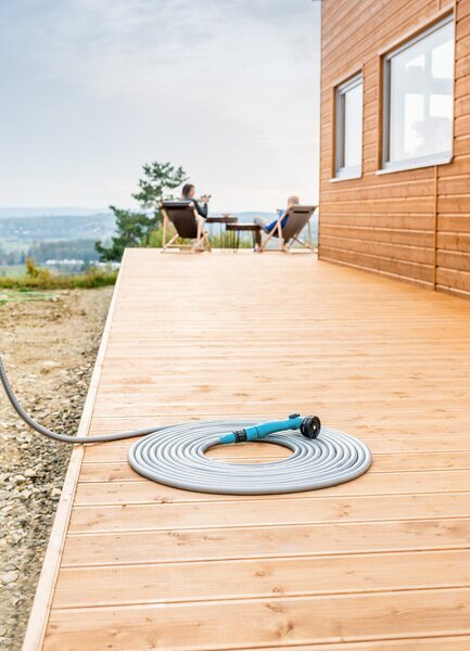 - Інноваційний та компактний садовий шланг, який збільшує свою довжину приблизно втричі під час подачі води під тиском та автоматично коротшає після зливу води;