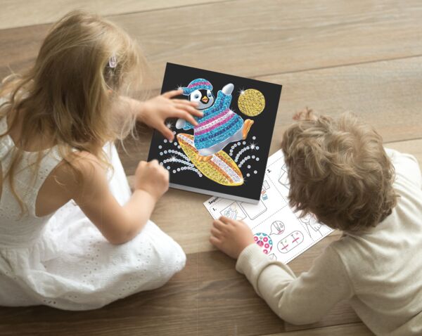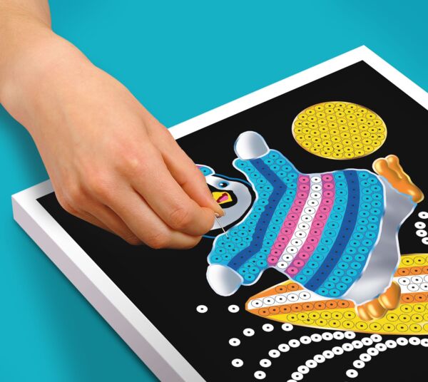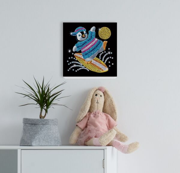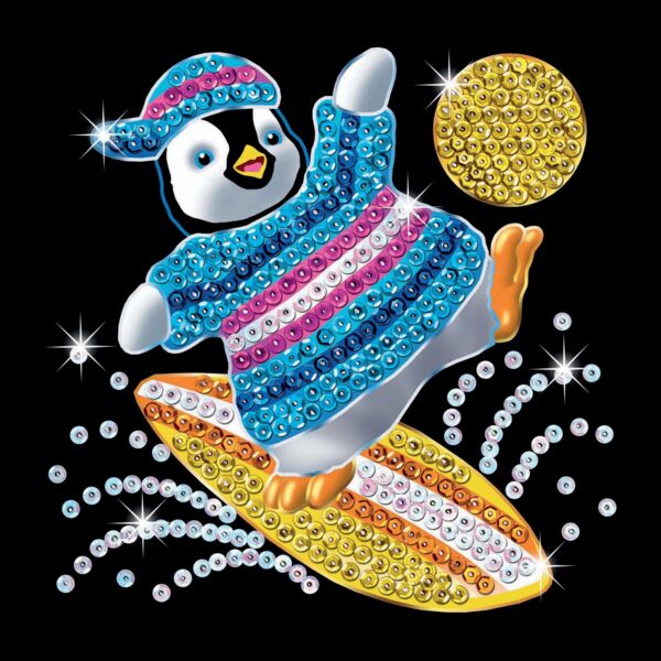 Sequin Penguin является увлекательным набором для детского творчества. Очень удобно, что места для наклеивания паеток обозначены соответствующим цветом, так ребенку легче ориентироваться на полотне. А изображение в виде пингвина будет интересным на только девочке, но и мальчику. Мелкий размер деталей позволяет развить усидчивость и внимательность, способствует улучшению моторики и умственной активности.
