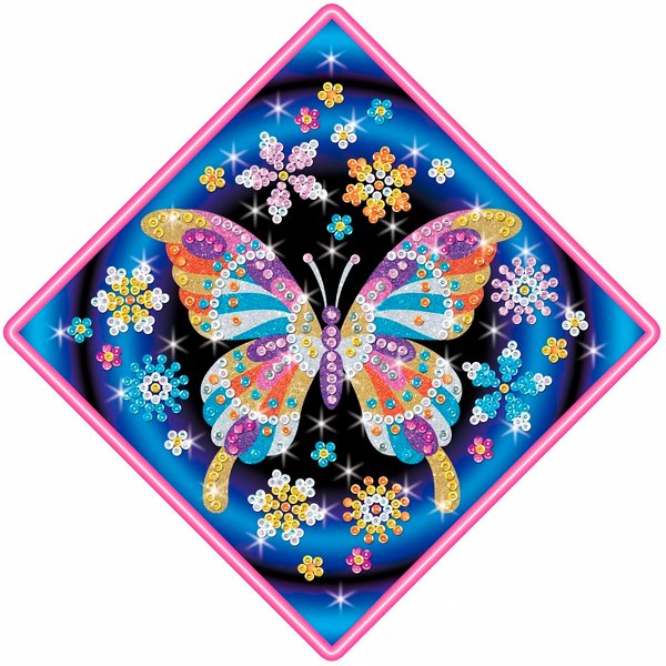 Картина з кольорового блискучого піску і паєток «Метелик» від виробника Sequin Art. Щоб зробити таку картину, необхідно пофарбувати рамку, потім розпорошити різнокольорову пудру на поверхню заготовки, що самоклеїться, а далі прикріпити за допомогою спеціальних кнопок невеликі паєтки в зазначені місця. У результаті кропіткої роботи при дотриманні всіх рекомендацій інструкції вийде захопливий метелик, візерунчасті крила якого мерехтітимуть заворожуючими переливами барвистих блискіток.