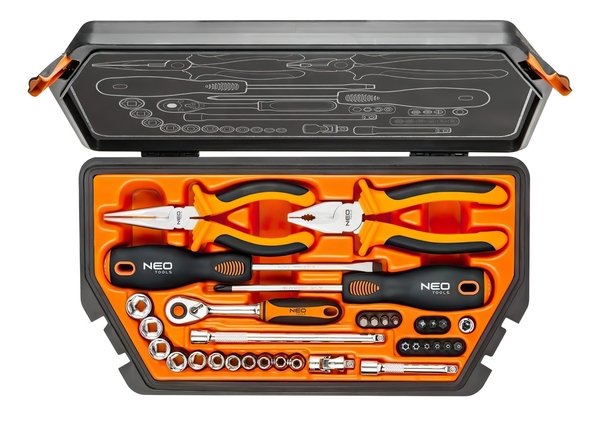 Набір інструменту NEO, складається з 33 предметів, виготовлених з високоякісної хромованадіевой стали. До складу набору входять плоскогубці комбіновані і подовжені, викрутки (шліцьова і хрестова), тріскачка 1/4" . У наборі багатий асортимент змінних головок 1/4" (розміри від 5 до 14 мм) і наконечників (хрестові, шестигранні, Torx з отвором ). Висока міцність наконечників гарантована сталлю S2. Додатково в наборі є зручні подовжувачі, шарнір і перехідник для змінних наконечників. Набір упакований в зручний чемоданчик. Якість інструменту підтверджено сертифікатом TÜV і 25-річною гарантією виробника. Бренд NEO виправдовує очікування професіоналів.