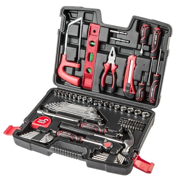 | Набір складається | Біти, Молоток, Ніж, Викрутка, Перехідник, Плоскогубці, Рулетка, Торцеві головки, Тріскачка, Подовжувач, Шестигранні ключі |