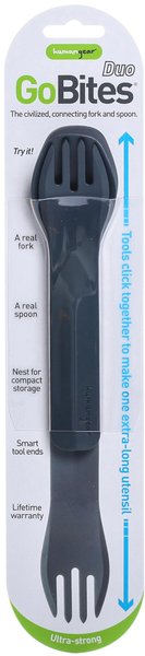 GoBites – це якісний, добре продуманий посуд, що може використовуватись як на природі, так і на вашій кухні. GoBites Duo – це набір із ложки й виделки, що можуть кріпитись разом, або ж використовуватись окремо. Набір Duo зроблений із надзвичайно міцного нейлону. Міцність виробу підкріплюється гарантією на 1 рік. GoBites виготовляються під гаслом «справжній посуд для справжніх людей». GoBites не містить BPA, PC та фталатів.