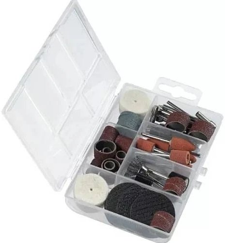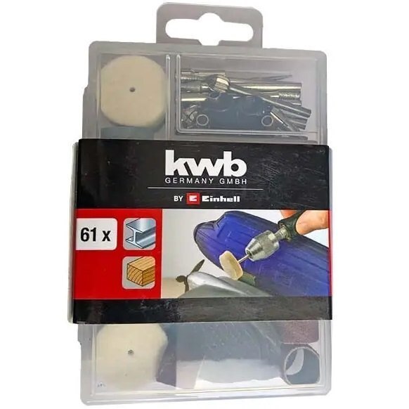 Набір насадок для гравера Einhell від бренду KWB, має всі необхідні елементи для виконання будь-яких робіт з гравером. Містить 61 предмет та поставляється в пластиковому прозорому кейсі для зручності зберігання.