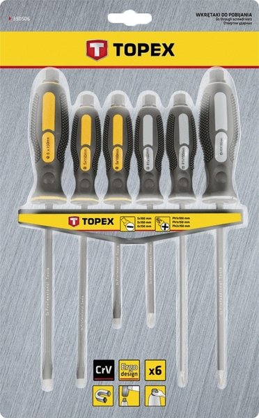 Набір викруток для підбиття TOPEX, призначені для затягування і відгвинчування прикипіла, міцно затягнутих гвинтів. Стрижень кожної з шести викруток виготовлений з міцної хромомолібденової сталі, що забезпечує довгий термін служби інструменту. Магнітне жало із загартованої сталі полегшує роботу з інструментом. Ергономічна пластикова рукоятка добре лягає в долоню, що підвищує комфорт роботи. На пластмасовій підвісці, що полегшує зберігання. Бренд TOPEX призначений для домашніх майстрів.