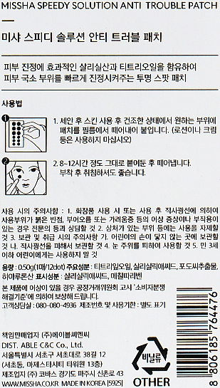 Missha Speedy Solution Anti Trouble Patch зроблені зі щільного гелю, просоченого лікарським складом. Створені для проблемних ділянок шкіри - акне, прищі, вугрі, гнійничкові ураження шкіри. Комплекс спрямований на усунення самої причини виникнення запалень і нейтралізує їх ще на початку формування. Наклейки так само виконують маскувальну функцію, закриваючи собою прищик. Зовнішня поверхня патча дає змогу наносити косметику.