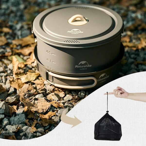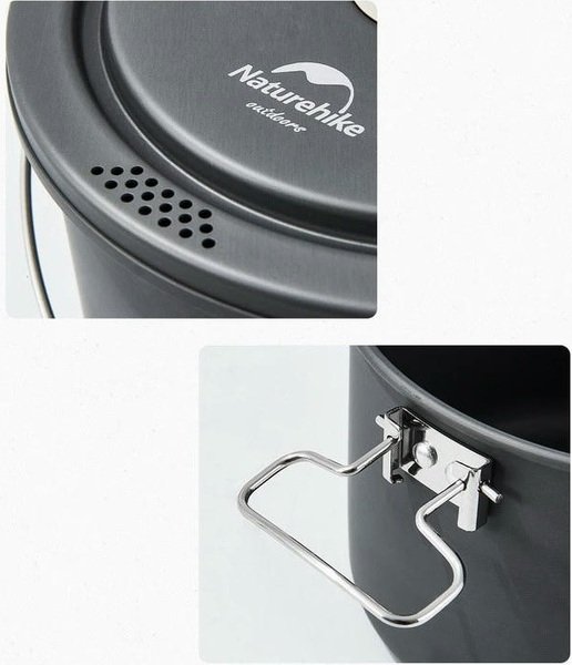 Комплект Naturehike CNH22CJ002 включає весь необхідний посуд, який потрібен для приготування їжі в польових умовах. Посуд сумісний з більшістю типів туристичних пальників і дає змогу одночасно приготувати кілька страв, щоб нагодувати групу з трьох осіб. До комплекту входить чотири основні предмети: дві каструлі, казанок і сковорідка - усі різного об'єму та розміру. Найбільша каструля (190х116 міліметрів) має об'єм 2.9 літра і підходить для готування перших страв. Мала каструля (172,7х97.2 міліметрів) і казанок (147,9х72 міліметри) мають об'єми 2 літри та 1.2 літра відповідно. Сковорода підходить для тушкування та смаження овочів і м'яса. Її розміри - 199х50х1,2 міліметрів. Весь посуд виготовлено з легкого та нержавіючого алюмінієвого сплаву. Його основна перевага - висока теплопровідність, тому поверхня котлів нагрівається швидше, що прискорює процес приготування їжі та дає змогу заощадити використовуване паливо. Крім того, під час обробки алюмінію на його поверхні з'являється тонка оксидна плівка. Вона абсолютно нешкідлива для здоров'я людини і сприяє зміцненню металу. Мала каструля, казанок і сковорода оснащені складними ручками з накладками з термостійкого пластику, який захищає користувача від опіків під час перенесення розпеченого посуду. У найбільшій каструлі передбачена одна металева ручка, за допомогою якої посуд можна підвісити на тринозі. На поверхню сковороди нанесено антипригарне покриття. У комплект також входить одна кришка для великої каструлі. На кришці присутня не тільки теплоізоляційна ручка, а й низка дрібних отворів, через які виходять надлишки пари. Їх також можна використовувати для зливу зайвої рідини. Після використання посуд досить очистити за допомогою м'якої губки з мийним засобом і промити під проточною водою. Для полегшення транспортування рекомендується скласти всі складові набору один в одного. У такому разі розміри комплекту становлять лише 204х204х122 міліметри, а вага - 864 грами. Комплектація також включає сітчастий чохол для зберігання.
