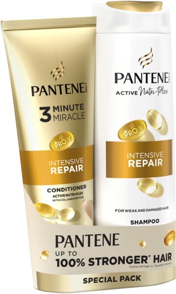 Відкрийте набір продуктів Pantene Intensive Repair, відмінного джерела живлення й захисту для вашого волосся. Ніжна формула з PRO-V та інноваційною технологією ACTIVE NUTRI-PLEX очищає волосся, забезпечуючи йому необхідні поживні речовини. Використання разом з засобом для догляду Pantene допомагає виправити ознаки пошкодження, такі як відсутність гладкості та блиску, зміцнюючи волосся зсередини. Протестовано Swiss Vitamin Institute.