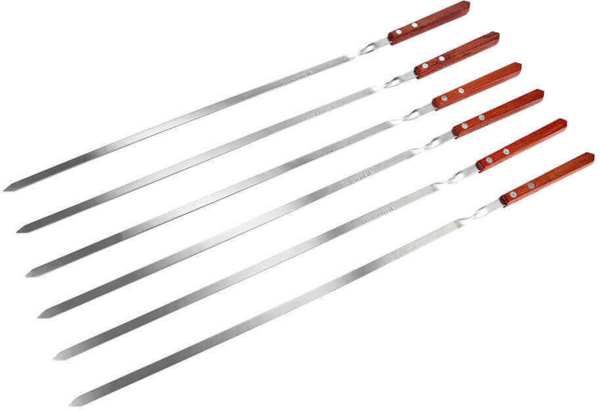 Шампури мають зручні ручки, виготовлені з матеріалу, що не нагрівається, забезпечуючи безпечне і комфортне використання. Металеві стержні шампурів міцні та стійкі до деформацій, що дозволяє надійно фіксувати м'ясо або інші інгредієнти під час приготування на відкритому вогні.
