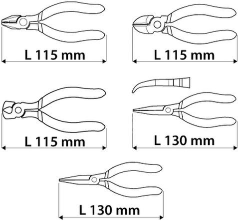 Набір шарнірно-губцевий прецизійного інструменту TOPEX, в наборі п'ять предметів. Кожен інструмент виготовлений із загартованої сталі, ріжучі кромки піддані індукційному загартуванню. Ергономічні рукоятки, покриті антискользящим матеріалом, забезпечують комфорт і безпеку під час роботи. Інструмент чудово підігнаний за формою долоні. Бренд TOPEX призначений для домашніх майстрів. Шарнірно-губцевий прецизійний інструмент, набір 5 шт., Плоскогубці комбіновані 115 м, кусачки бокові 115 мм, кусачки торцеві 115 мм, плоскогубці подовжені прямі 130 мм, плоскогубці подовжені вигнуті 130 мм, рукоятки з еластичним покриттям, розтискати пружина.