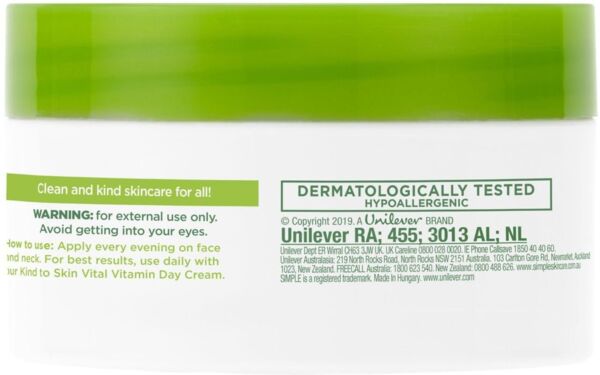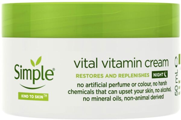 - Вітамінний нічний крем - Simple Kind To Skin Vital Vitamin Cream: наносити ввечері на обличчя і шию. Для досягнення найкращих результатів використовуйте щодня разом з вітамінним денним кремом Simple Kind to skin.