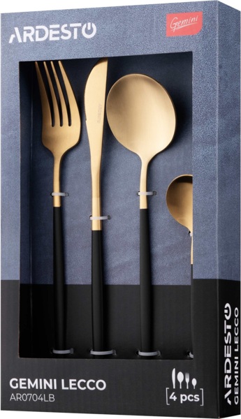 Набір столового приладдя Ardesto Gemini Lecco з чотирьох предметів — це ідеальне доповнення до вашого сервірування. Виготовлені з нержавіючої сталі 18/0, приладдя мають золотисто-чорне матове покриття. Матеріал відомий своєю винятковою міцністю, стійкістю до корозії та довговічністю, що гарантує збереження первісного вигляду навіть при щоденному використанні та частому митті. Розмір та вагу предметів оптимально збалансовано для комфортного використання: ніж (35 г, 222 мм), виделка (30 г, 214 мм), столова ложка (40 г, 207 мм) і чайна ложка (15 г, 154 мм). Вироби придатні до миття в посудомийній машині.