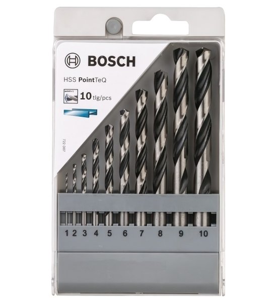 Набір з 10 спіральних свердел Bosch HSS-PointTeQ діаметром 1, 2, 3, 4, 5, 6, 7, 8, 9, 10 мм, робочою довжиною 12, 24, 33, 43, 52, 57, 69, 75, 81 , 87 мм для швидкого виготовлення отворів в металі. Самоцентрувальні насадки з технологією заточування PointTeQ з кутом при вершині 135 градусів не прослизають, гарантують продуктивну свердління. Зносостійкі, з тривалим терміном експлуатації.