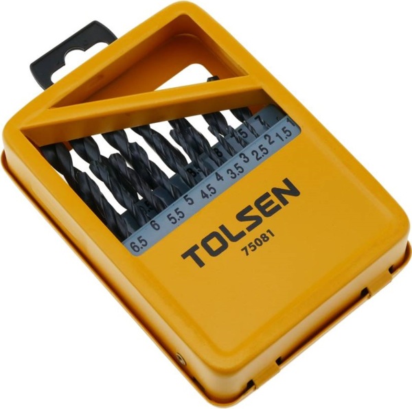 До складу набору Tolsen 75081 входить 19 високопродуктивних свердел, виготовлених зі спеціальної швидкорізальної сталі HSS (High-Speed Steel), що гарантує їхню виняткову твердість, стійкість до високих температур, які виникають під час свердління, та тривалий термін служби навіть при інтенсивному використанні. Кожне свердло в наборі пройшло процес чорнування, що створює на його поверхні спеціальне захисне покриття. Свердла оснащені стандартним циліндричним хвостовиком. Кут заточення ріжучої кромки становить 118°, свердло легко проникає в матеріал, забезпечуючи чистий та акуратний отвір з мінімальним утворенням задирок.
