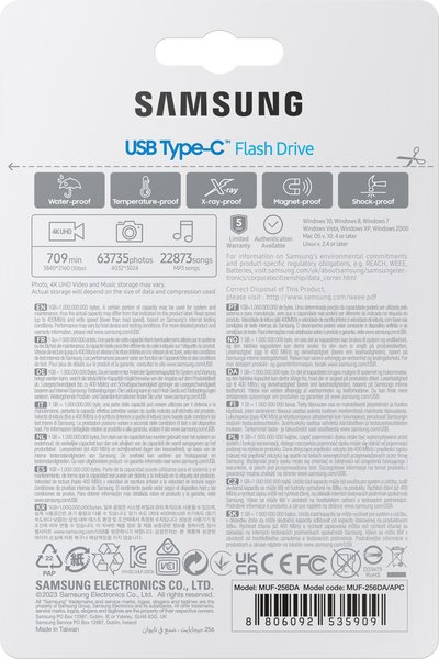 Файли залишаються в безпеці, де б ви не були. Лідерство Samsung у виробництві флеш-пам'яті робить накопичувач Type-C надійним пристроєм для зберігання ваших цінних даних. Він має водонепроникний, ударостійкий, магнітостійкий, термостійкий та рентгеноконтрастний корпус, на який надається 5-річна обмежена гарантія.