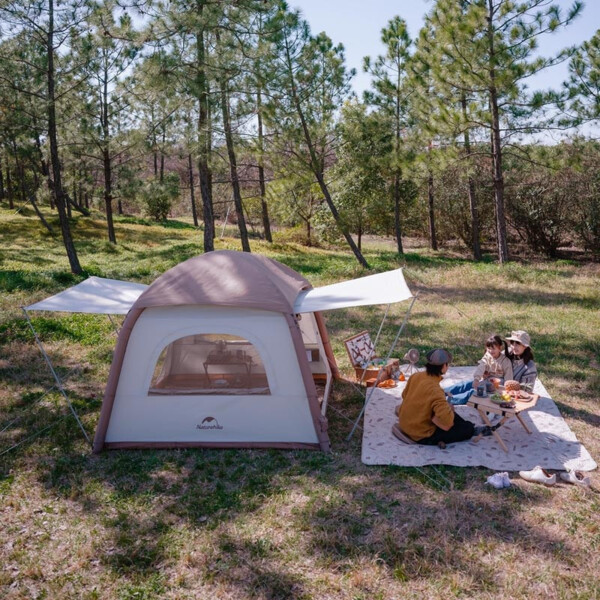 Зовнішній тент виготовлений з якісного матеріалу – оксфордської тканини 150D, який також захищає від палючого сонця. Ступінь захисту - СПФ 50. З двох сторін можна зробити навіси для комфортного відпочинку в спеку. Завдяки наявності сітчастих вікон як на даху, так і з усіх боків у наметі забезпечується двостороння вентиляція.