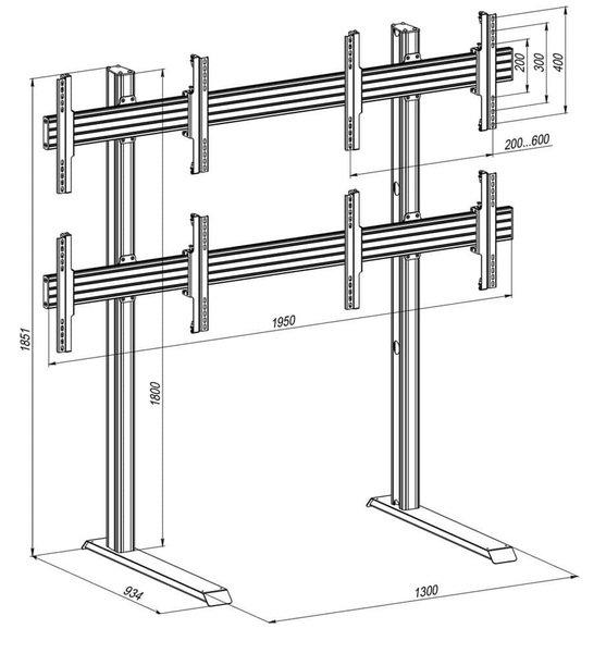 Підлогова стійка для відеостіни VSP4422F з опорами з алюмінієвого профілю застосовується для зручності монтажу та подальшого технічного обслуговування відеостіни. Дисплеї встановлюються по всій висоті опор до 1800 мм. Система мікро-регулювання в 3 площинах дає змогу вирівняти екрани в безшовну відеостіну. У цій моделі передбачено захист від випадкового підбивання дисплея, а також приховане укладання кабелів. Стійка підходить для РК/LED телевізорів з діагоналлю до 55 дюймів і вагою до 50 кг на один дисплей. Довжина горизонтальних опор -2000 мм. Підтримуваний стандарт VESA: min 200×200, max 600×400 mm.
