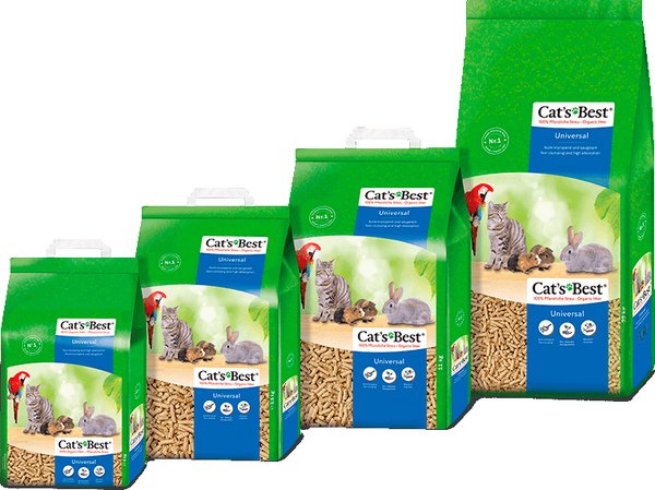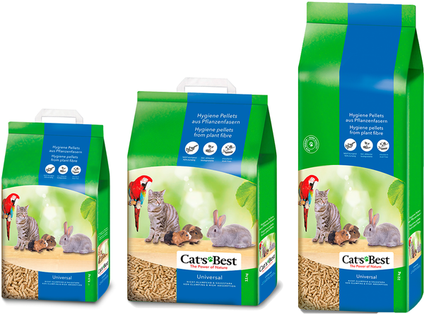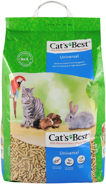 Може використовуватися різними способами для більшості порід дрібних тварин. Ми рекомендуємо Cat's Best Universal як підстилку для домашніх тварин, у яких є кілька різних дрібних тварин, за якими потрібно доглядати. Завдяки високій поглинаючій здатності Cat's Best Universal також ідеально підходить як додатковий наповнювач для типових вологих місць, таких як поїлки тощо. Підходить для гризунів, птахів і котів. Виготовлений зі 100% рослинних волокон.