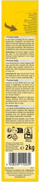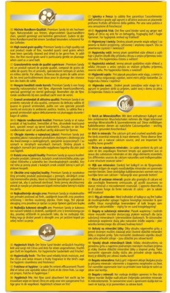 Пісок для птахів Sandy є ідеальним гігієнічним наповнювачем для клітки птахів. Пісок містить морські раковини та мінерали, які є природним джерелом кальцію та позитивно впливають на здоров'я папуги і його кісток. Це чудовий засіб для сточування дзьоба і пісочних "ванн". Пісок відмінно вбирає рідину, а завдяки анісу та цитрусовим відсутній неприємний запах у клітці.