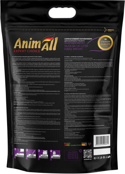 Наповнювач для котячих туалетів на основі силікагелю від AnimAll. Це висушений гель полі кремнієвої кислоти, який хімічно складається з того ж з'єднання, що і звичайний пісок , але є високо пористим тілом, тому має величезну площу поверхні. Завдяки цій властивості він має унікальну абсорбуючу здатність.