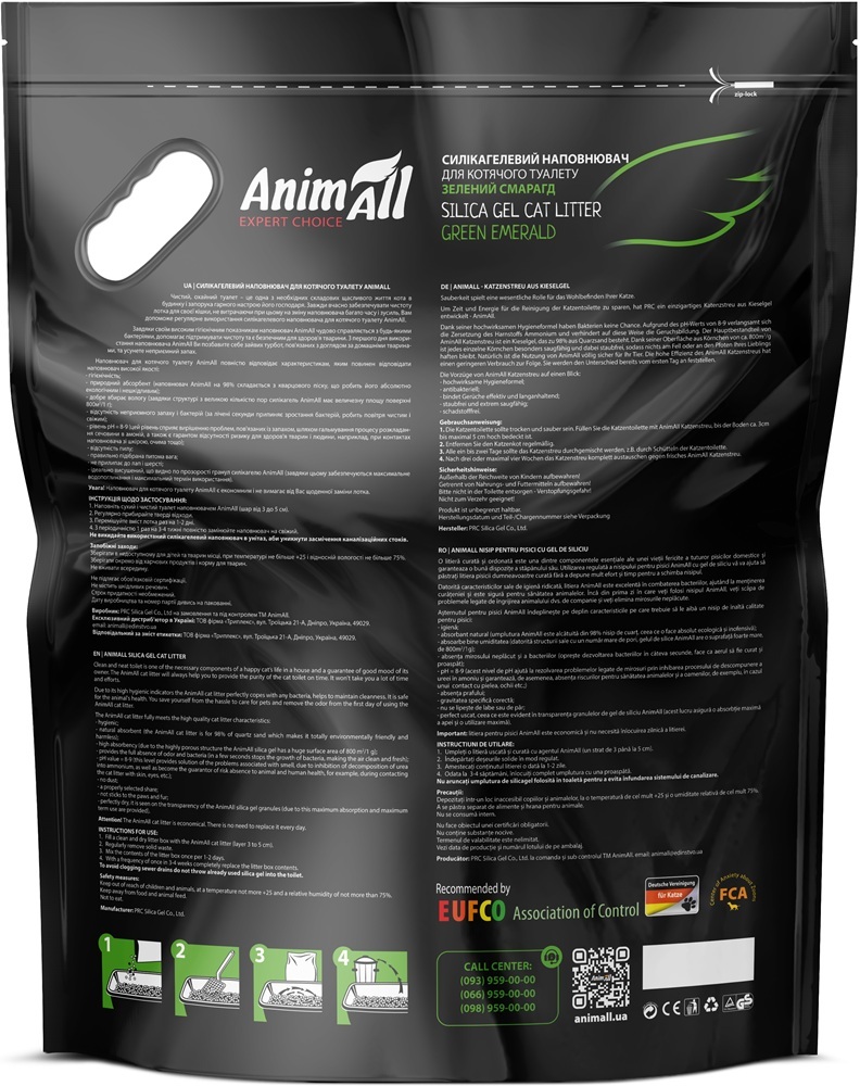 Наповнювач для котячих туалетів на основі силікагелю від AnimAll. Це висушений гель полі кремнієвої кислоти, який хімічно складається з того ж з'єднання, що і звичайний пісок , але є високо пористим тілом, тому має величезну площу поверхні. Завдяки цій властивості він має унікальну абсорбуючу здатність.