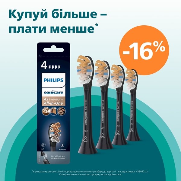 Універсальна насадка для щітки A3 Premium ідеально підходить для знімної ручки Philips Sonicare (див. список унизу). Просто встановіть і зніміть для легкої заміни і чищення.