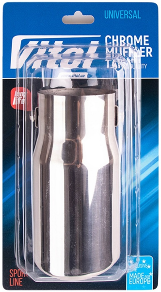 Насадка на глушник від торгової марки Vitol виготовлена на сучасному високоточному обладнанні, що гарантує високу якість виконання виробу. Діаметри насадок відповідають самому поширеній розміром вихлопних труб у глушників легкових і вантажних автомобілів. Насадка на глушник несе в собі дві властивості, перше це захист вихлопної труби від корозії, практично повністю, виключаючи контакт вихлопної труби з зовнішньо середовищем, друга властивість - це поліпшення естетичного вигляду автомобіля.