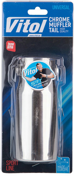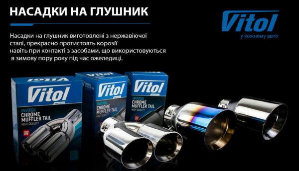Насадка на глушник від торгової марки Vitol виготовлена на сучасному високоточному обладнанні, що гарантує високу якість виконання виробу. Діаметри насадок відповідають самому поширеній розміром вихлопних труб у глушників легкових і вантажних автомобілів. Насадка на глушник несе в собі дві властивості, перше це захист вихлопної труби від корозії, практично повністю, виключаючи контакт вихлопної труби з зовнішньо середовищем, друга властивість - це поліпшення естетичного вигляду автомобіля.
