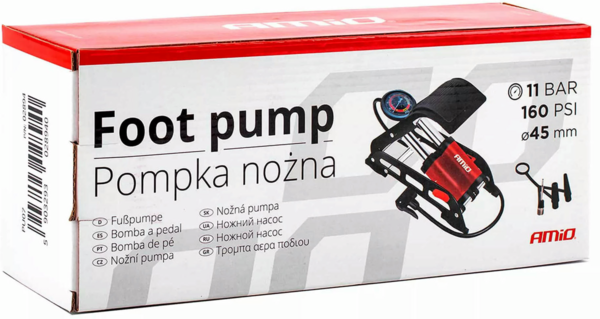 Помпа Amio автомобільна PU07 - двопоршнева ножна помпа міцної конструкції з пресованого лакованого сталевого листа товщиною 3 мм для кращої стійкості. Легко читаний манометр, що показує в барах (0-11) і PSI (0-160). Міцний і гнучкий шланг довжиною 750 мм. Ідеально підходить для професійних послуг та домашнього господарства.