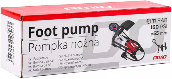 Помпа Amio автомобільна PU06 - однопоршнева ножна помпа міцної конструкції з пресованого лакованого сталевого листа товщиною 3 мм для кращої стійкості. Легко читаний манометр, що показує в барах (0-11) і PSI (0-160). Міцний і гнучкий шланг довжиною 750 мм. Ідеально підходить для професійних послуг та домашнього господарства.