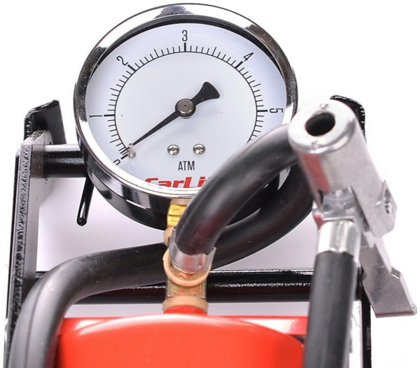 У цьому вам допоможе одноциліндрова помпа CarLife FP841 - незамінна річ не лише в вашому автомобілі, але й в будинку. З його допомогою можна легко накачати автомобільну або велосипедну шину, а також футбольний дитячий м'яч повітрям. Модель виготовлена зі зносостійких матеріалів: корпус разом з колбою виготовлені з металу. Металева педаль оснащена гумовою накладкою, яка запобігає ковзанню ноги під час накачування. Розмір циліндра становить 80x130 мм, з максимально допустимим тиском 6 атмосфер. Дана помпа має вбудований манометр, за допомогою якого можна відстежувати тиск в шині.
