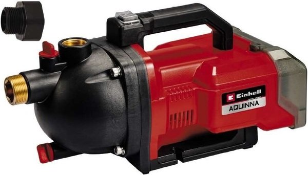 Самовсмоктувальний насос садовий акумуляторний Einhell AQUINNA лінійки Power X-Change system серії Expert plus призначений для зрошення, поливу саду або подачі води з резервуарів. Садовий насос AQUINNA живиться від двох 18В акумуляторних батарей PXC із захистом від перегріву і забезпечує максимальну продуктивність 3000 л/год при тиску до 2,6 бар. Є гвинт для заливання води, а також захист від замерзання завдяки зливному гвинту. Eco режим зменшує максимальну висоту подачі до 17 м і максимальний тиск до 1,7 бар, але при цьому збільшується час роботи насоса на одному заряді. Завдяки зручній ручці для перенесення насос садовий акумуляторний Einhell AQUINNA можна швидко перенести туди, де він необхідний. Насос живиться від двох 18-вольтових батарей. Інструмент поставляється без акумуляторів і зарядного пристрою.