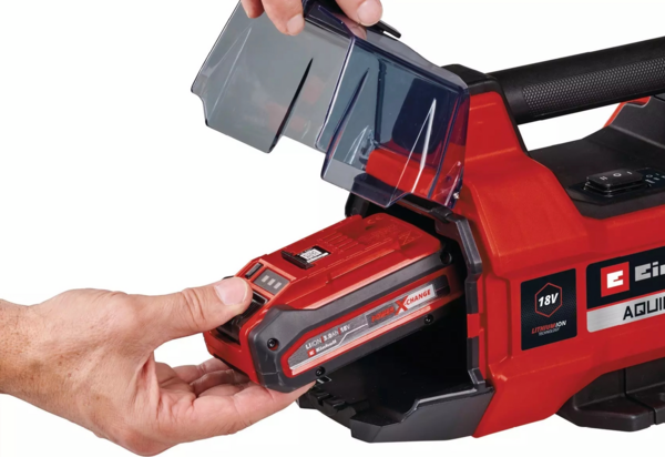 Акумулятор, встановлений у насосі, оптимально захищений від бризок води та пилу кришкою акумуляторного відсіку.
