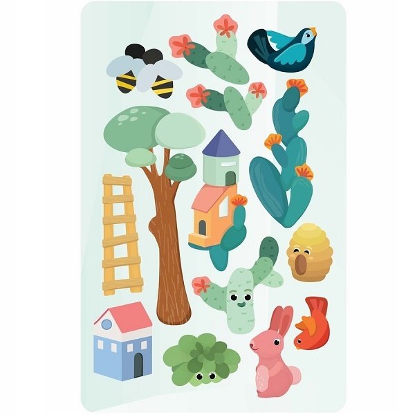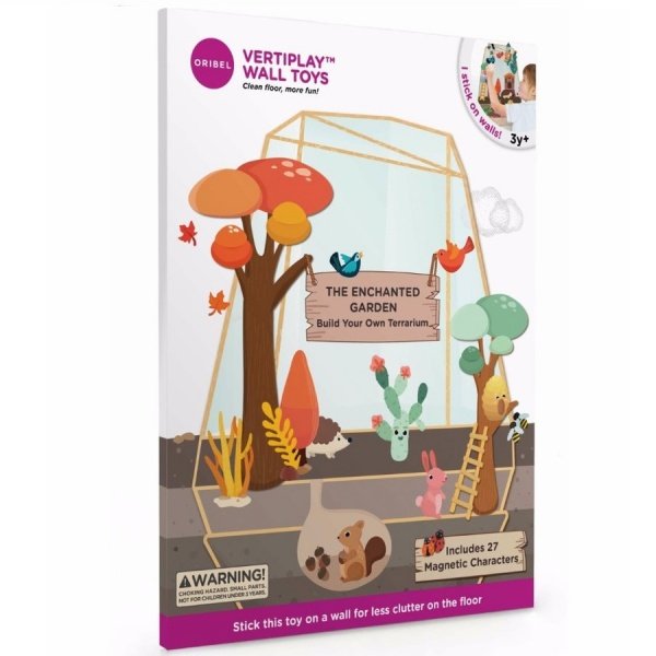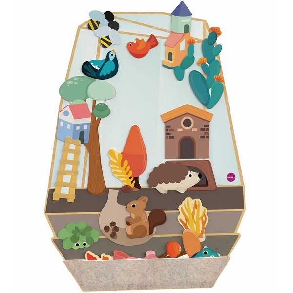 VertiPlay – це магнітна дошка, приклеєна до стіни з кількома наклейками. Це рішення економить місце на підлозі, просто прикріпіть іграшку до стіни або двері. Білки, їжачки, літаючі птахи, бджоли і кактуси, жолуді та інші рослини є мешканцями Чарівного саду – магнітної головоломки, яка представляє два сезони:весну і осінь.