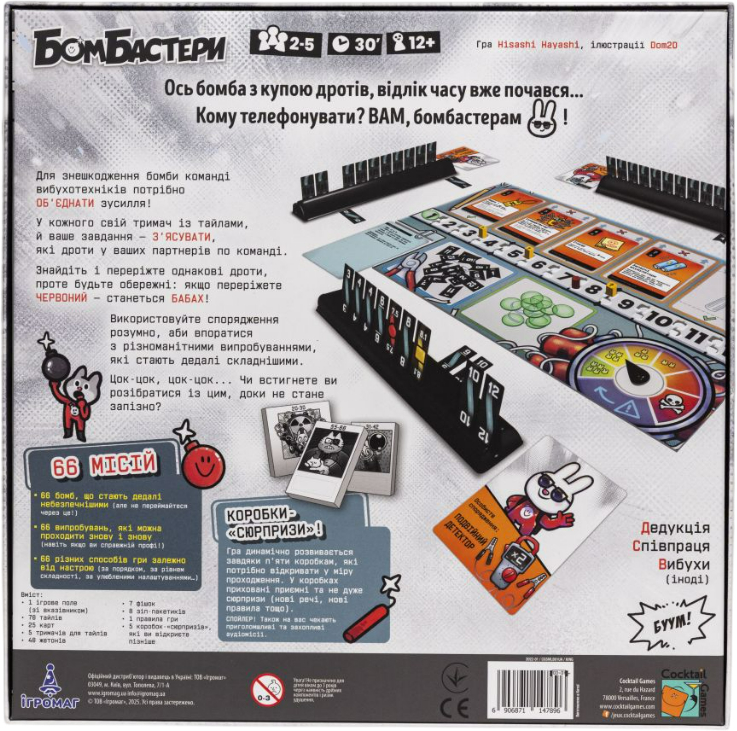 Настільна гра Бомбастери (Bomb Busters) - це веселий кооператив, в якому найскладніше - мовчати. А зберігати тишу доведеться, адже при всій своїй кумедності, настільна гра вимагає неабиякої концентрації, дедукції та сталевих нервів. Гравцям потрібно професійно знешкодити бомбу, тож готуйтесь до постійного відчуття, що хтось от-от переріже не той дріт і місія буде провалена.