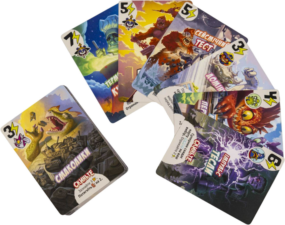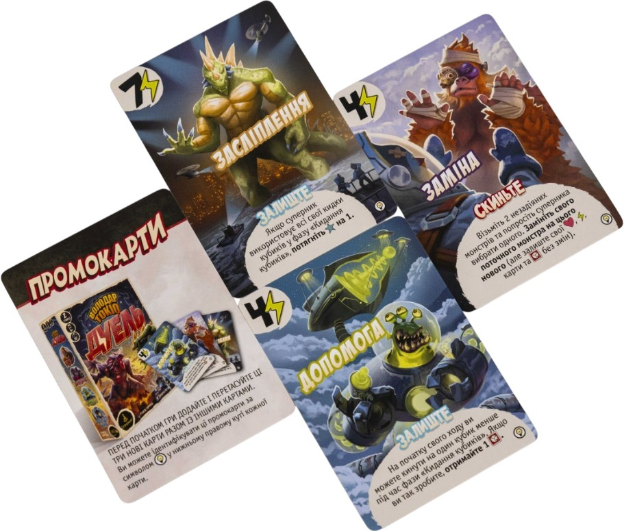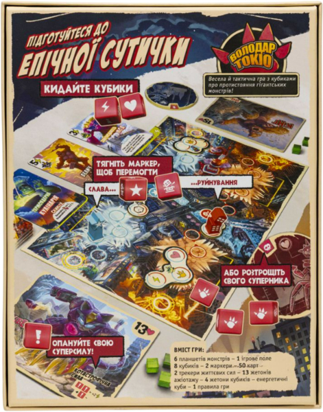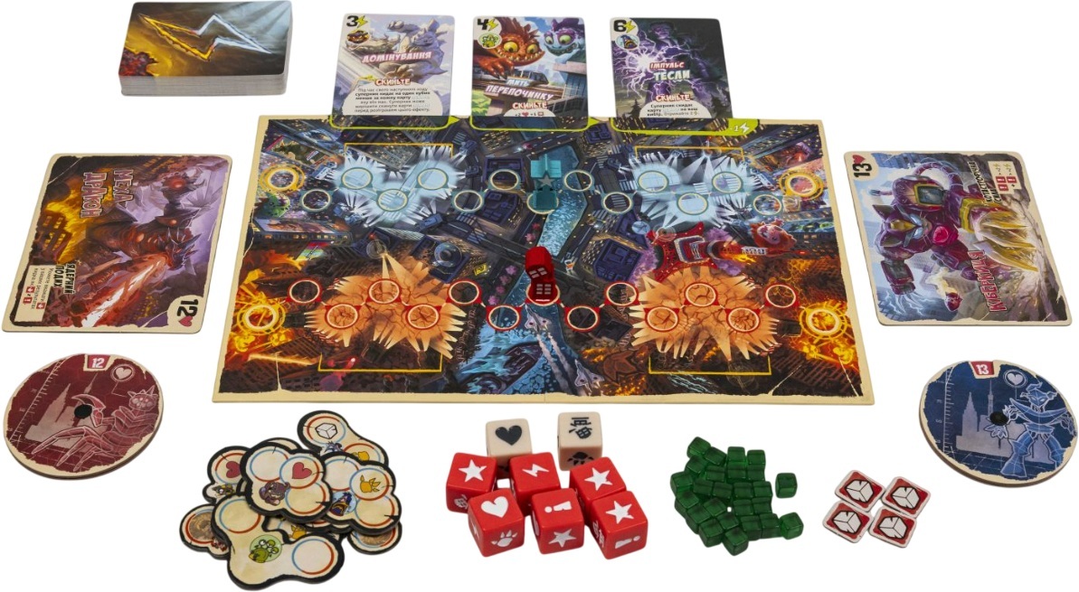 | Комплектація | Ігрове поле, Документація, Жетон – 17 шт., Карта – 50 шт., Кубик – 8 шт., Маркер - 2 шт., Планшет монстра – 6 шт., Трекер – 2 шт., Енергетичні куби |