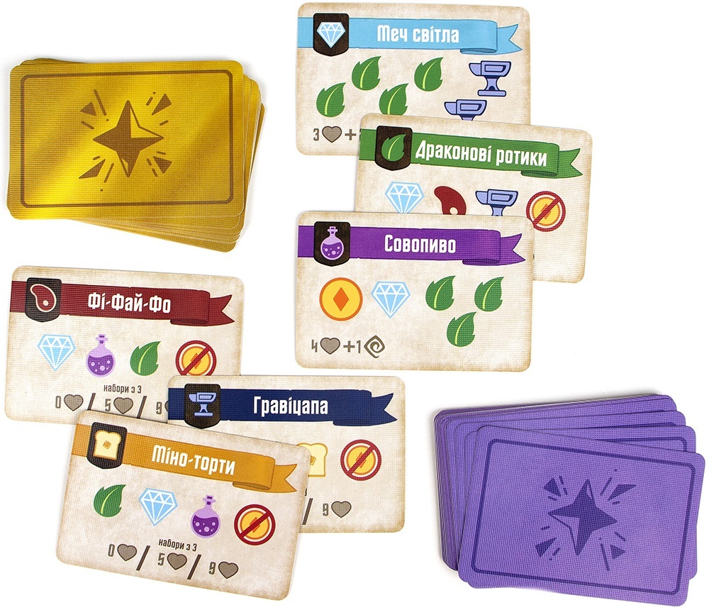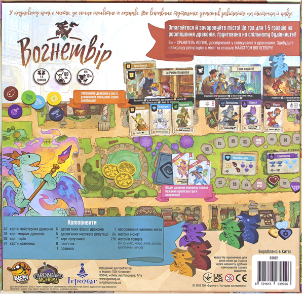 | Комплектація | Ігрове поле, Документація, Жетон – 234 шт., Карта – 155 шт., Маркер репутації – 6 шт., Пам'ятка – 8 шт., Фішка – 6 шт. |