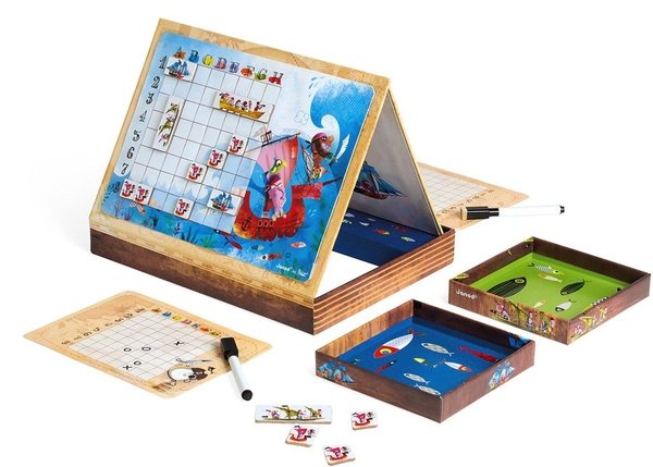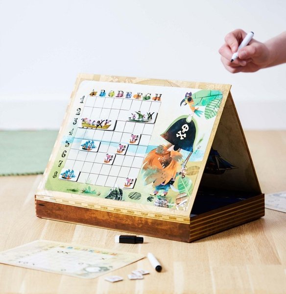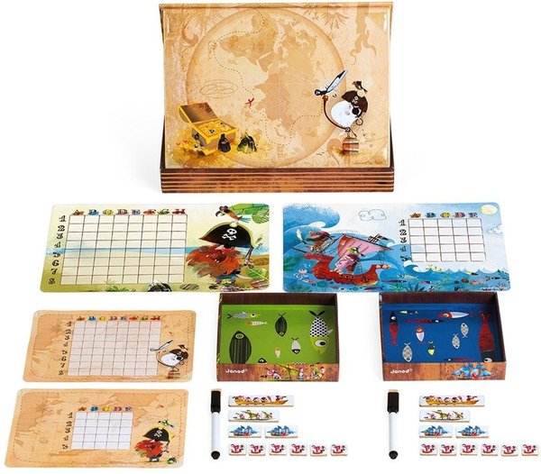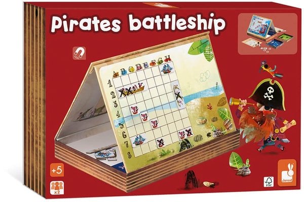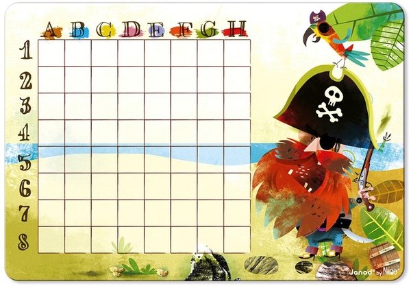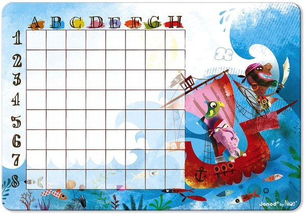 Настольная игра Janod из серии Битва пиратов привела в восторг моих детей и всю семью. Теперь нет необходимости самому расчерчивать поля. Мы только спокойно размещаем свои кораблики и отмечаем попадания в соперника. При этом потом маркер легко стирается с поля и оно остается чистым для следующего применения. Материалы изготовления классные, ничего не ломается и не перегибается. Кораблики магнитные, крепятся быстро и просто, никаких проблем не возникает. Они не заламываются и не меняют цвет на солнце.