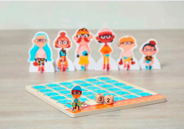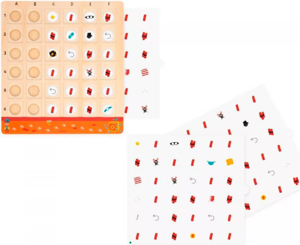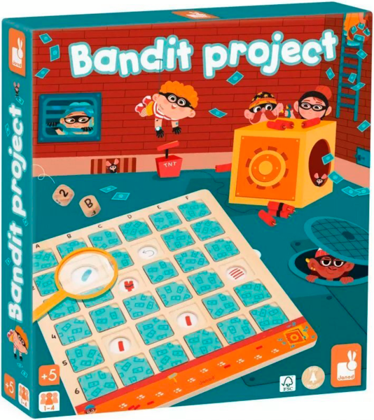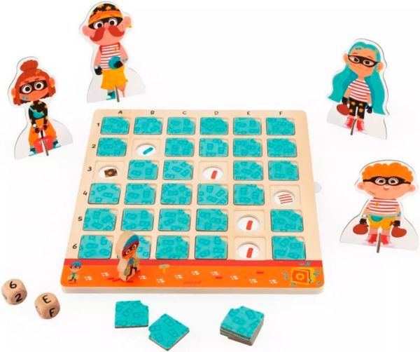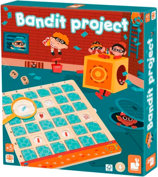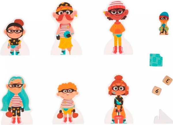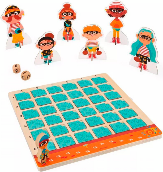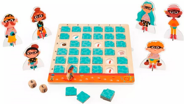 Дотепні детективи мають допомогти викрити підозрюваного, який намагається пограбувати банк! Поодинці або в команді (до 4 гравців) зберіть якомога більше доказів, перш ніж бандиту вдасться заволодіти награбованим! Ця дерев'яна розвивальна гра захоплива й обов'язково залучає розумові, спостережливі та логічні навички дітей віком від 5 років. Крім того, вона познайомить малюків із принципом роботи дошки з подвійним записом. Щоб зібрати потрібні підказки, необхідно знати, як знайти квадрат, вказаний на кубику (через правильний стовпчик і рядок). Прибравши картку, яка знаходиться на перетині цих двох частин інформації, ви отримаєте нову підказку. У наших 6 підозрюваних є відмінні риси, які, на щастя для вашого розслідування, можуть допомогти видати їх. Але будьте обережні і не сідайте на динамітну шашку, адже це дозволить бандиту просунутися трохи ближче до своєї дорогоцінної здобичі.