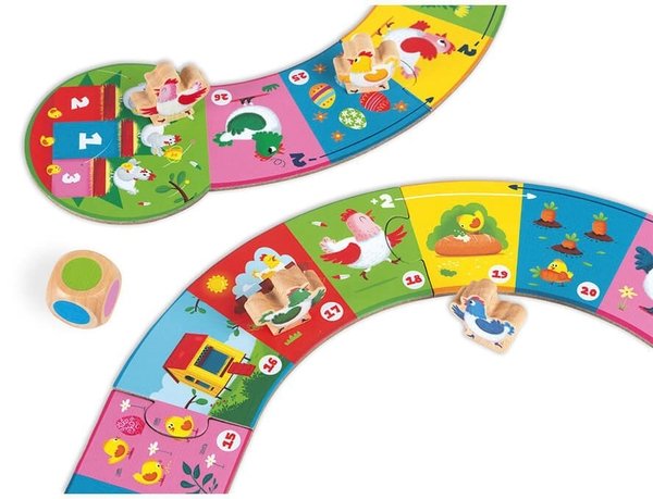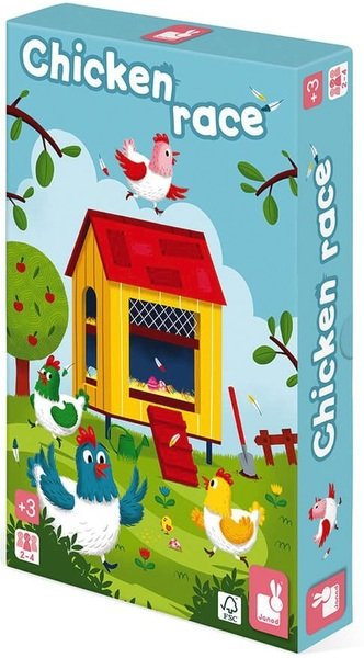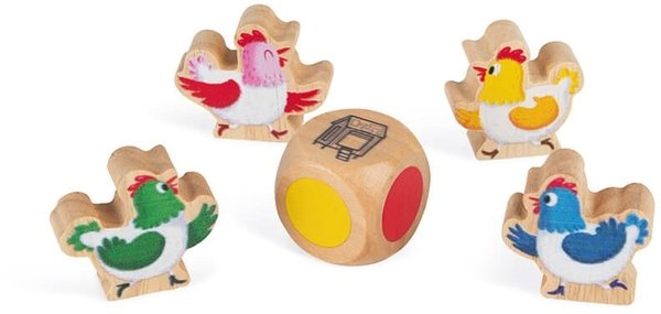 Гонка в курнику триває... вони як божевільні кудхають! І недарма! Здається, фермер забув замкнути двері, і починається Велика втеча! Наші 4 маленькі кольорові курочки мають одну мету: уникнути перешкод і прийти до фінішу першими! Їм треба буде бути кроком попереду фермера. Якщо він їх упіймає, вони знову опиняться! Ця проста настільна гра для дітей від 3 років допомагає їм звикнути до квітів та чисел, не кажучи вже про те, щоб розважити всю родину! Це також чудове введення в основні принципи настільних ігор: кидання кубиків, переміщення фішки по дошці, наближення до фінішу, навчання перемог та поразок, а також навички наведення порядку. (1-й, 2-й, 3-й тощо. буд.). Містить 1 дошку-головоломку з 10 частинами, 1 кубик та 4 жетони курки. Піднос зроблений з картону, частини та кубик – із цільного дерева. FSC-сертифікована настільна гра , виготовлена з деревини з екологічно безпечних лісів.