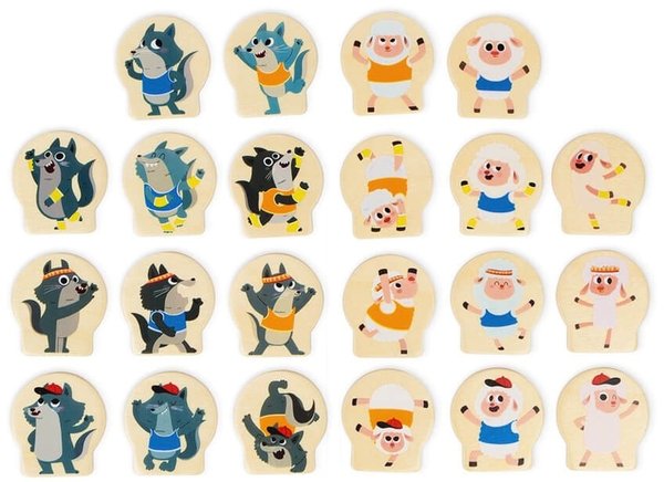 Настав час для великих змагань з акробатики на лузі! Вовки та ягнята з'являються у своїй найкращій спортивній формі і прагнуть до вершини піраміди. Виберіть команду: час розігрітися! Правила цього змагання дуже суворі: жоден спортсмен не може торкатися іншого спортсмена, крім як в одній команді або в одній і тій же формі! Вам потрібно бути дуже спостережливим, щоб визначити, на чиї плечі ви можете встати, щоб досягти вершини, не впавши зі зоряного рефері! Той, хто поставить більше фішок до кінця гри, стає переможцем. Ця гра на мислення та логіку для дітей від 5 років та старша розрахована на 2 гравців. Містить 11 дерев'яних жетонів вовків, 11 дерев'яних жетонів ягняти та 1 дошку.